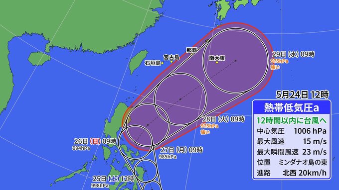 予報円内を進めば大東島地方が暴風域に入る可能性