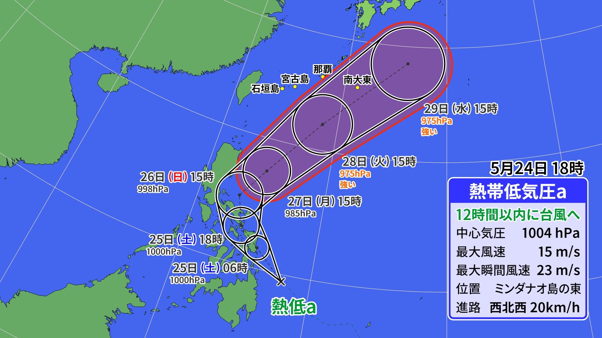 24日午後6時現在、ミンダナオ島の東で熱帯低気圧が発生しています。まだ台風にはなっていませんが、今後台風に発達する見込みです。今後の予想について詳しく解説します。