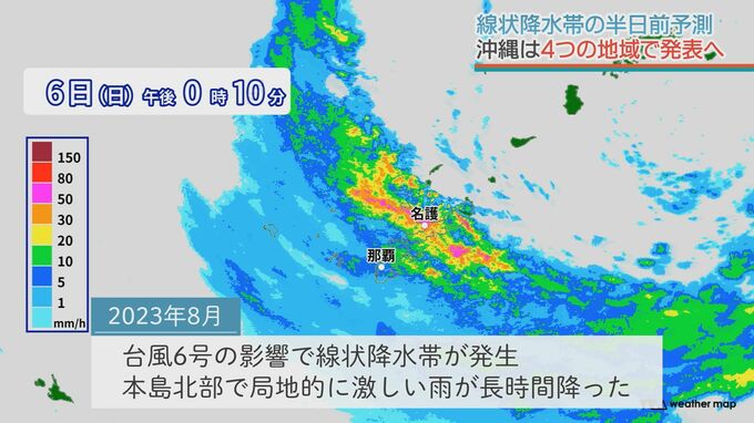 「線状降水帯」とは、次々と発生する積乱雲が列をなし、長時間にわたり同じ地域に大雨が降る現象だ。2023年8月には、台風6号の影響で沖縄地方に線状降水帯が発生し、本島北部で局地的に激しい雨が長時間降り続いた。