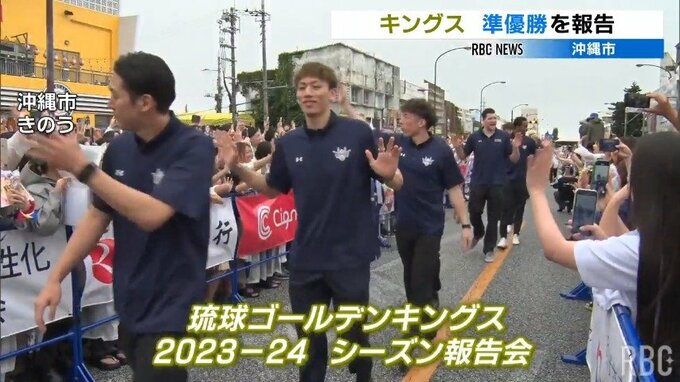 3季連続でファイナルに進出し準優勝した琉球ゴールデンキングス。選手たちが沖縄市のコザゲート通りに姿を現すと、待ち構えた市民やブースターたちが熱い声援で出迎えました。