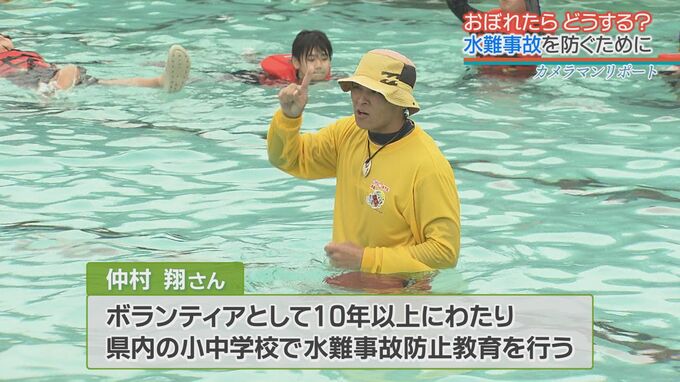 服を着たまま泳ぐ「着衣泳」を教えるのは、仲村翔さん。消防士でもある仲村さんは、11年前にボランティア団体を立ち上げ、県内の小中学校などを回り、水難事故を防ぐための特別授業を行っている。