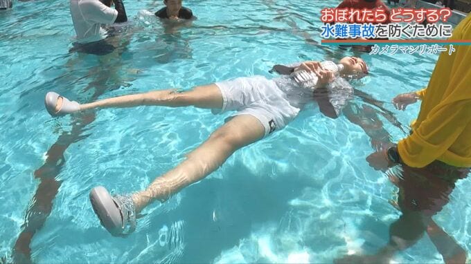 水難事故を少しでも減らすためには、服を着たまま溺れてしまったときの対処法を知っておくことが大切だ。仲村さんは、水に浮きながら助けを待つ方法を教えている。