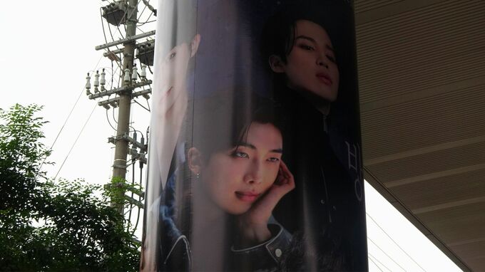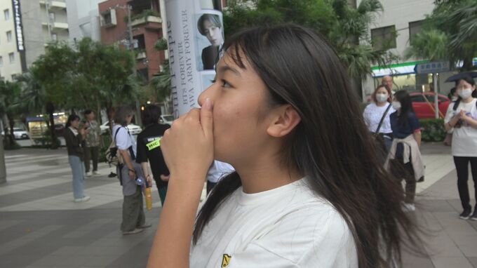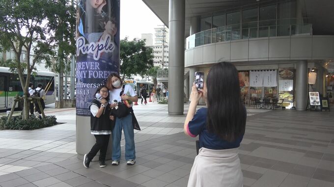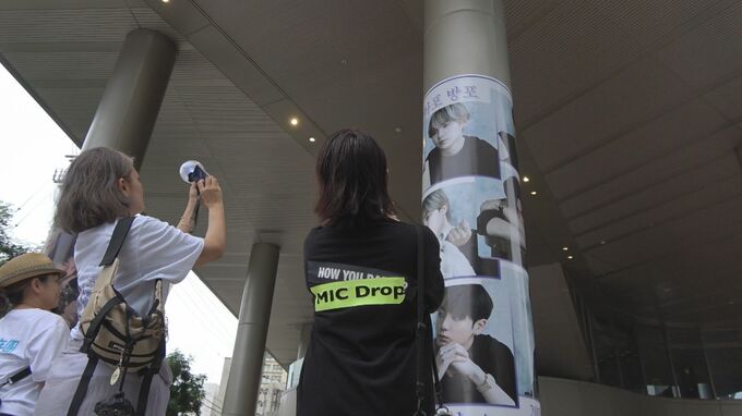 熱心なARMYたちが集まっていたのは、琉球新報社(那覇市)の本社ビル。彼女らが企画したBTSの「推し広告」がビルの円柱にラッピングされ、笑顔で記念写真におさまっていた。那覇からおよそ20キロ離れた本島中部から駆けつけた親子連れARMYの姿もあった。