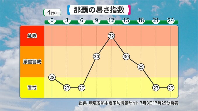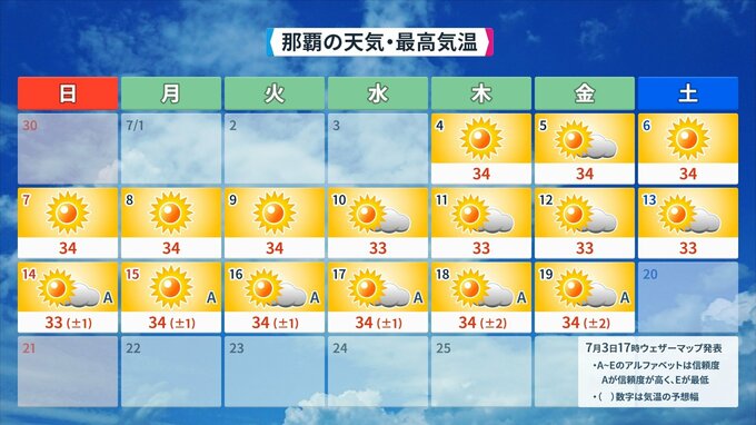 4日も各地で文句なしの晴れ。 夏本番の強い日差しが照り付けるでしょう。この夏空、那覇の7月中旬までのお天気と予想最高気温では…