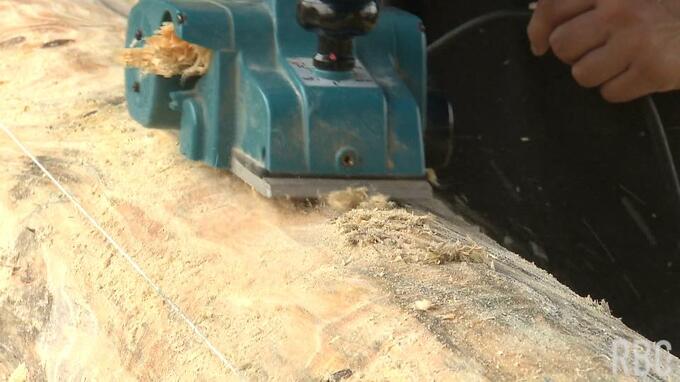 削られているのは、全長4メートルのリュウキュウマツ。細かに確認しながら作るのは、綱引きに欠かせない道具「カナチ棒」です。