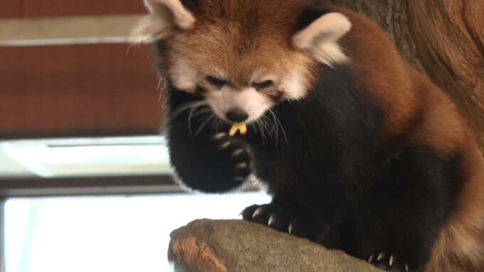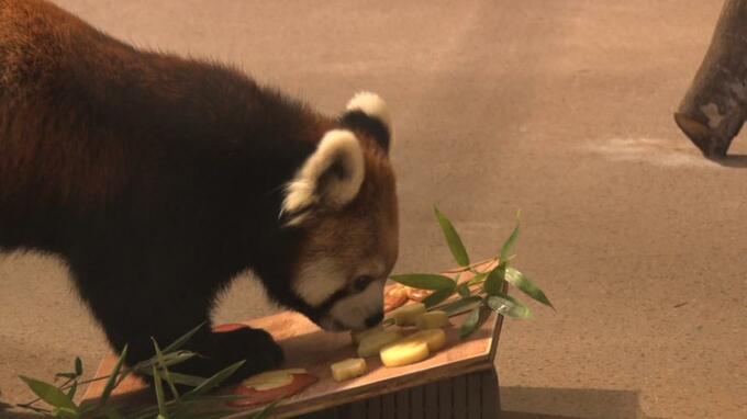 県内では名護市のネオパークオキナワでしか会えないレッサーパンダが誕生日を迎え、大好物のリンゴやサツマイモがプレゼントされました。