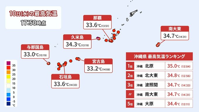 10日に県内で最も気温が上がったのは久米島空港。35℃で、県内今年4回目の猛暑日となりました。まだまだこの暑さは続きます。