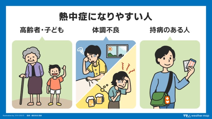高齢者や子ども、そして体調不良時も要注意です。夜更かしして寝不足だったり、飲み過ぎで二日酔いの時も、熱中症になりやすい傾向です。