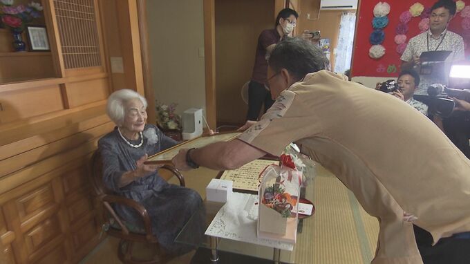 ことし玉城知事は北中城村を訪れ2人の女性の長寿を祝し、祝い状と記念品を贈りました。