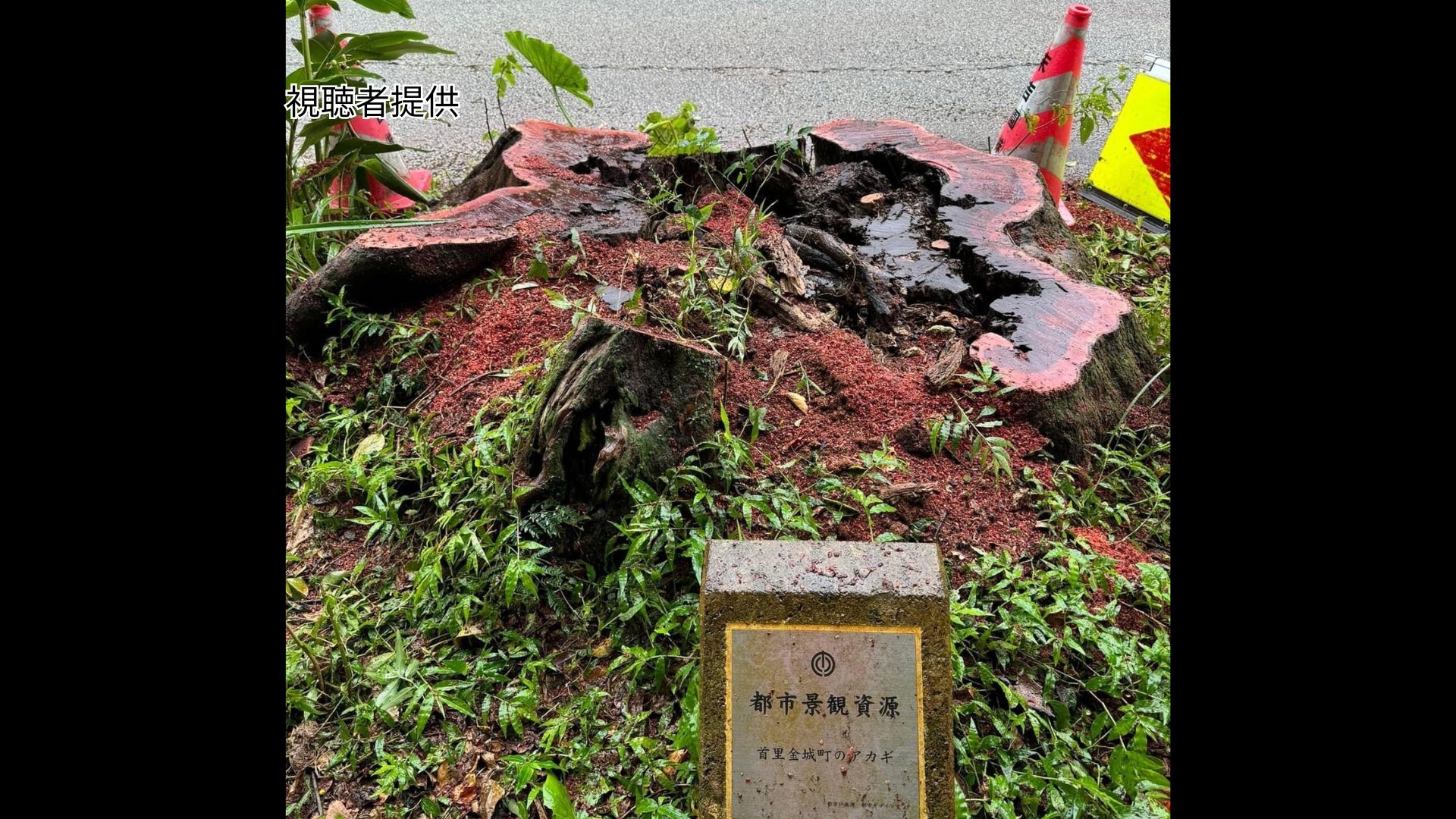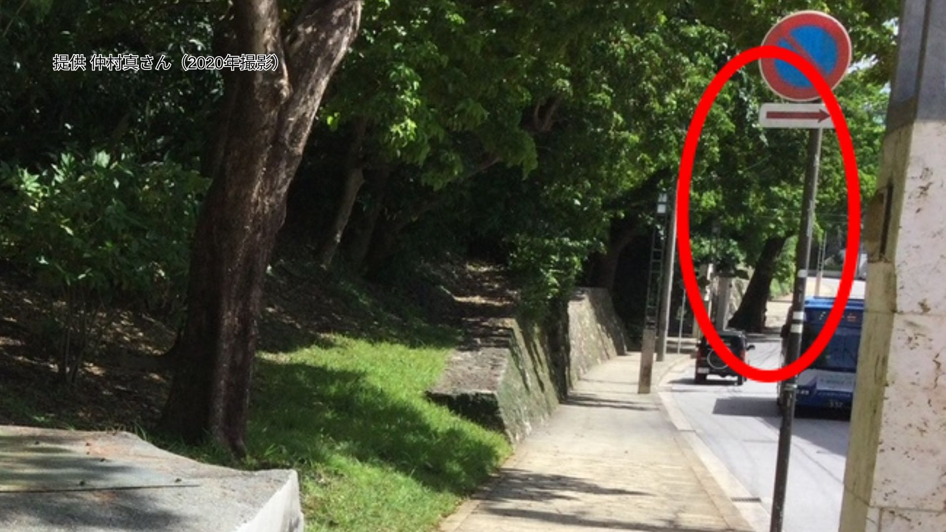 「泣きアカギ」は、良好な状態で保全すべき那覇市の「都市景観資源」として維持管理され、現場の歩道はアカギが立っていた場所を避けるようにして整備されていました。