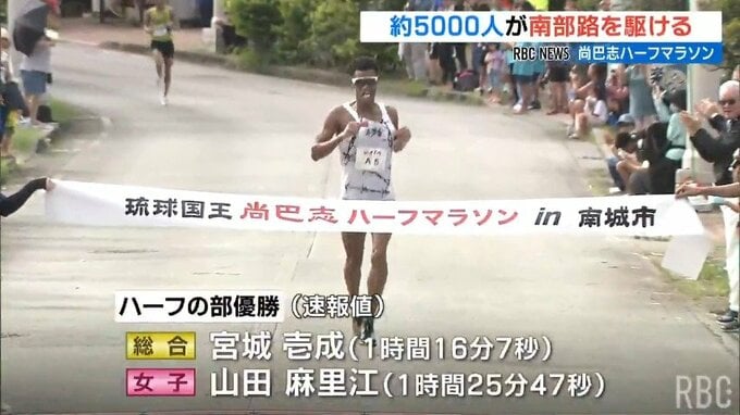 ハーフの部では北谷町の宮城壱成さんが1時間16分7秒で優勝、女子は与那原町の山田麻里江さんが優勝しました。