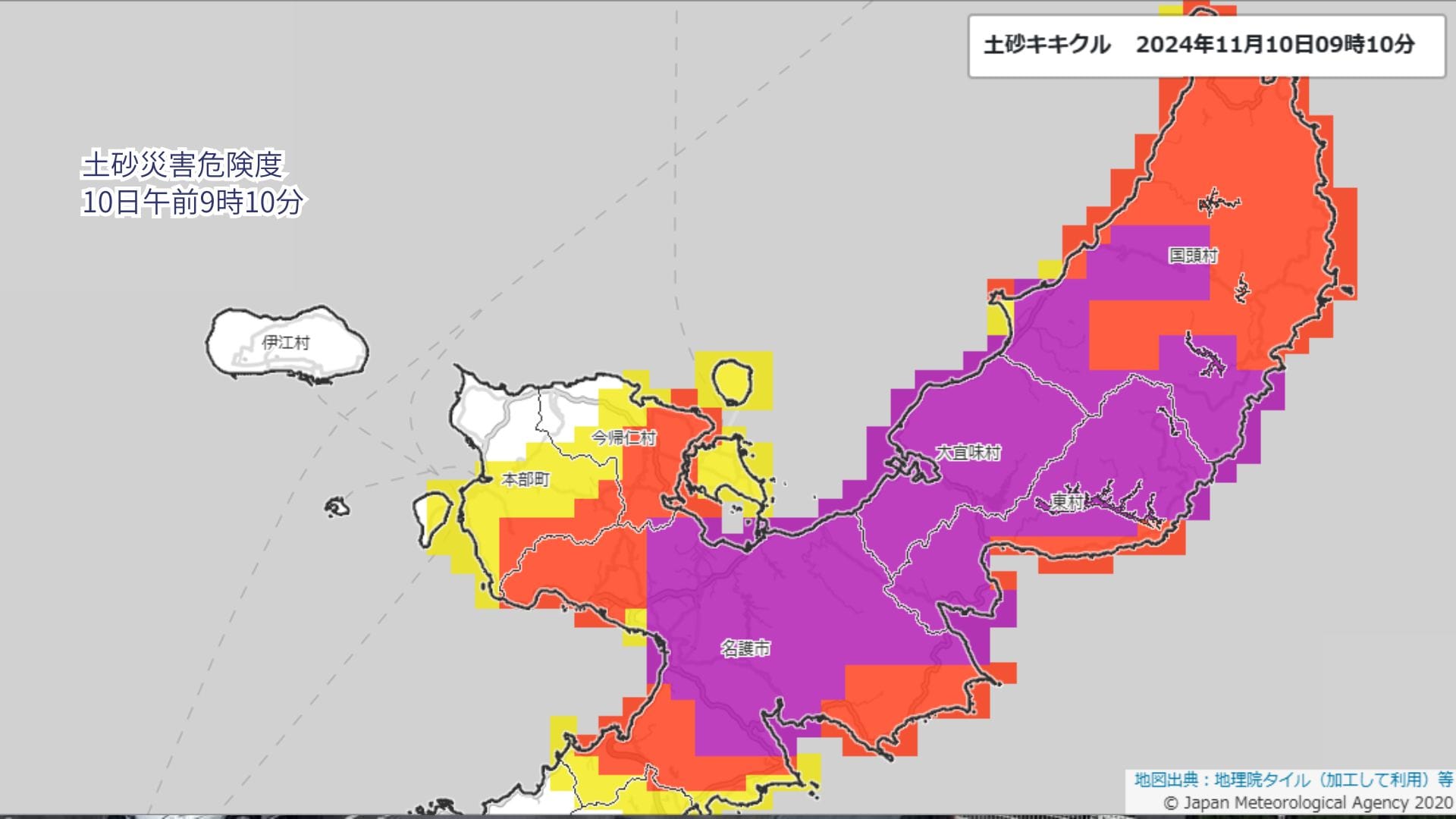 【午前10時更新】 恩納村、宜野座村に土砂災害警戒情報が発表されました。降り続く大雨のため、土砂災害の危険度が高まっています。