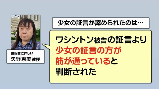 「ただ判決に気になる点もあった。判決では、ワシントン被告が当時、被害少女が『やめて。ストップ』と言うまでは、同意していないことが認識できなかった可能性を指摘している」