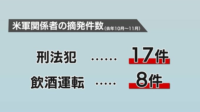 一方警察によると、米軍が制度を見直した去年10月1日から、統計が出ている11月末までに米軍関係者の刑法犯の摘発件数は17件。飲酒運転での摘発は8件となっています。