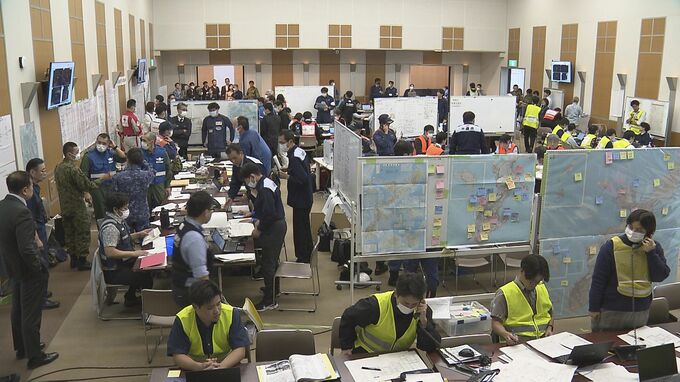 訓練では地図やホワイトボードに各地の被害状況などが次々と書き込まれ、それぞれの担当者が避難所の開設や必要となる支援物資の手配などについて、情報を収集しました。