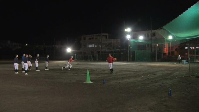 甲子園を目指して練習に励む宜野座高校野球部。ミーティングやグラウンド整備の時間も含めると、部活の終了時刻は午後8時半を過ぎる。今回の減便の影響で、最後まで練習に参加できなくなった生徒もいる。