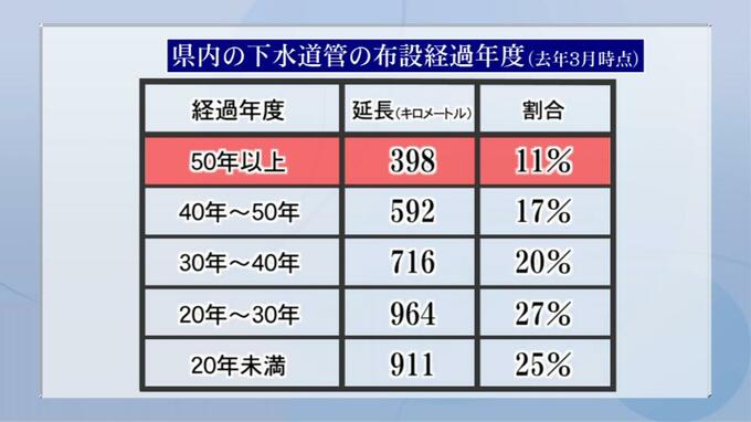 県が管理する下水道管の使用年数に関するグラフです。耐用年数の目安となる50年を超える下水道管は県内に約400キロ。全体の11%です。今後、この割合は増えていくことが予想されますが、県は限られた予算と人員の中で、優先順位をつけて対応していくことにしています。