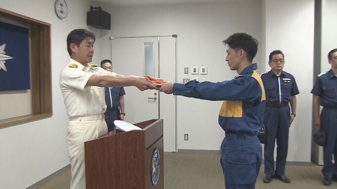 17日、機動救難士の証であるオレンジ服が手渡されたのは、第11管区海上保安本部那覇航空基地所属で浦添市出身の伊志嶺徳也さん(30)です。