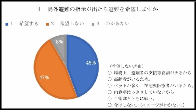 このほか、与那国町では一昨年9月・10月に住民との意見交換会が開かれました。避難を希望するかどうかのアンケートでは、「希望する」が45%、「希望しない」が47%、「わからない」が8%となりました。