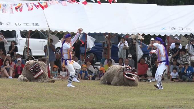 サバニ競漕のあとは漁港広場で、久松海神祭の名物、航海安全と豊漁を祈る獅子舞や御願角力も行われて、終日大勢の地域の人たちでにぎわっていました。