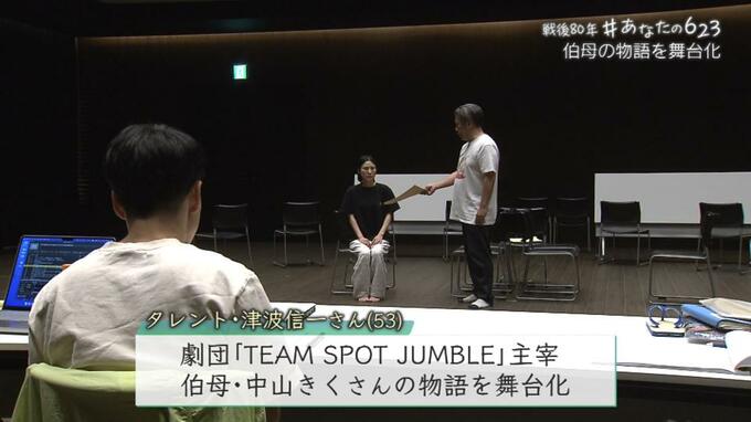 劇団「TEAM SPOT JUMBLE」の主宰で、タレントの津波信一さん(53)。自身の伯母で、元白梅学徒隊の中山きくさんの物語を舞台化し、稽古に励んでいます。