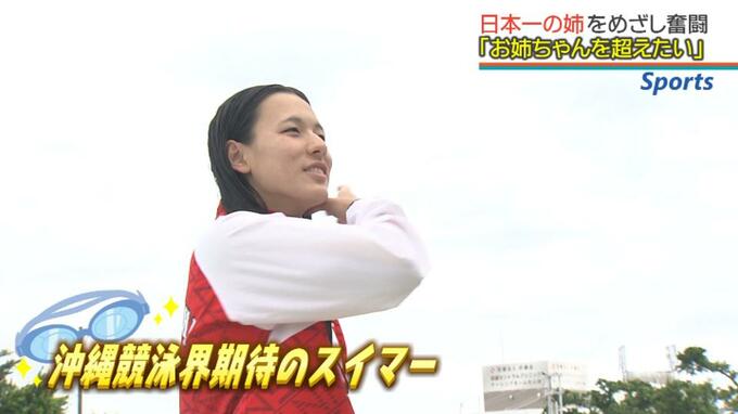 去年、自由形で県勢競泳界初の国民スポーツ大会を制し、50mと100mの二冠を達成した沖縄競泳界期待のスイマーに、美愛梨は幼いころからライバル心を燃やしています。