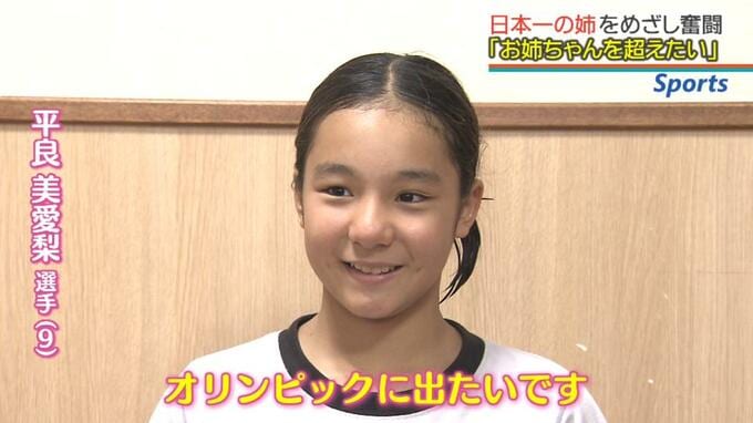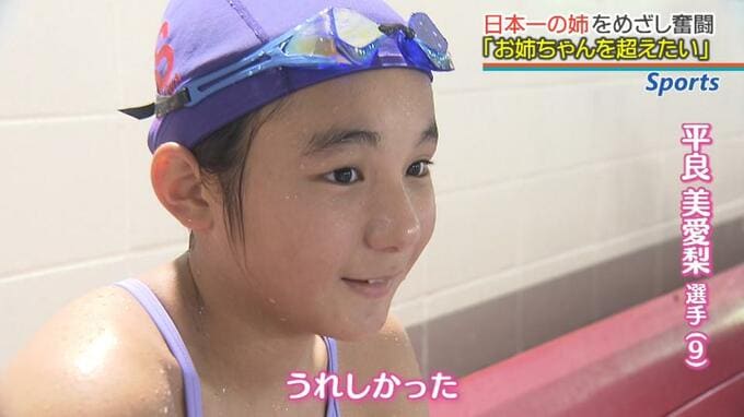 美愛梨選手は13日(日)開催される県大会に出場する予定で、目標は小学3・4年生の自由形で姉の大会記録を塗り替えることだということです。