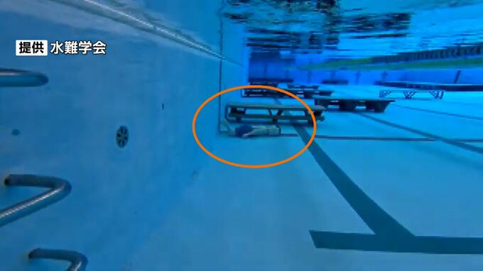 溺れて沈んだ人を発見することの難しさを伝える実験映像があります。水深1.3メートルのプールの底に人形を沈めた実験では、水中からであれば5メートル先からでも沈んだ人形が見えますが、水中から出ると、目視では確認できないことがわかります。(実験の画像は画像リンクでご確認ください)
