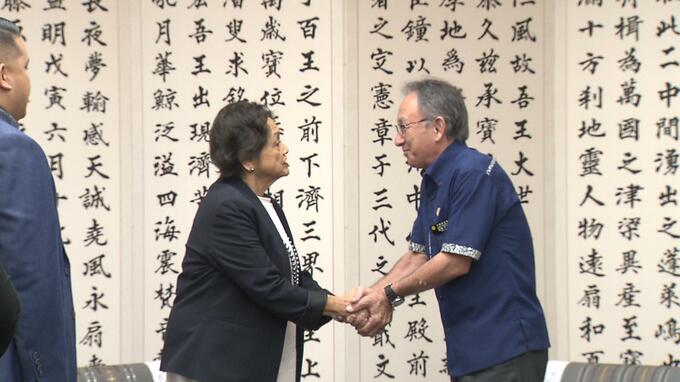 アメリカ軍基地の視察などを目的に沖縄を訪れているグアムのルー・レオンゲレーロ知事が18日県庁を訪れ、玉城知事に建設中の新たな海兵隊基地の進捗状況などを説明しました。