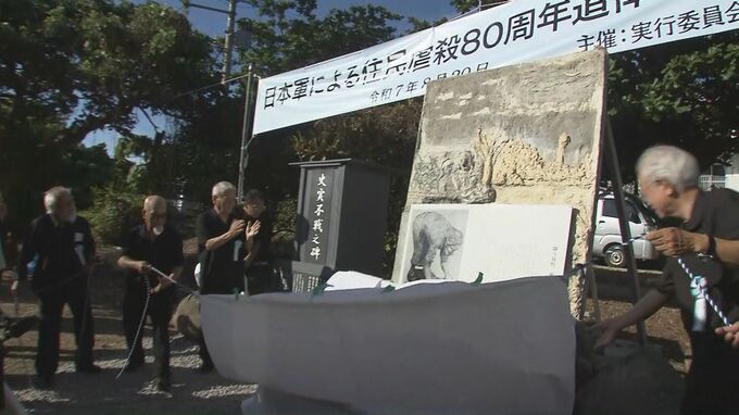 犠牲者のうち、生後数か月の赤ちゃんを含む一家7人が殺害されてから80年となった8月20日、有志の会による追悼集会が開かれ、犠牲者を悼むとともに住民虐殺を後世に語り継いでいこうと平和への誓いをあらたにしました。