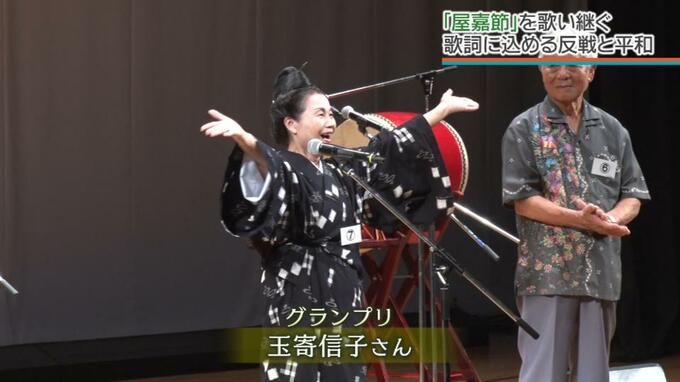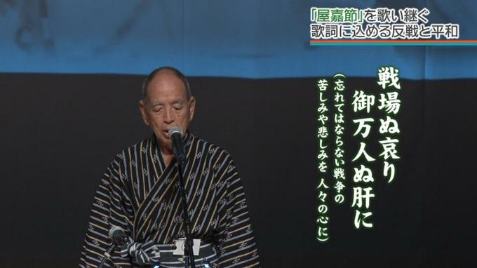 先月、屋嘉節を次の世代につなげようと開かれた屋嘉節大会。「屋嘉節」のメロディーにあわせ、反戦や平和への思いを綴った自作の歌詞を、12人が披露しました。出場者最高齢の儀間憲徳さん(88)。