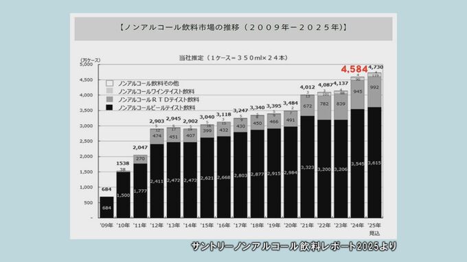 大手飲料メーカーサントリーが先月発表した調査結果によると、去年のノンアルコール飲料市場は、4584万ケースと10年前のおよそ1.6倍と推定され、過去最大規模となっています。