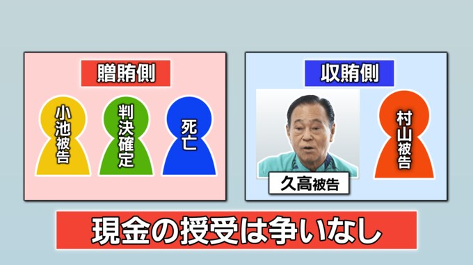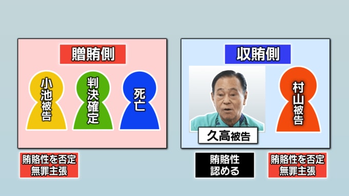 久高被告は、私的に使える金銭を受け取ったとして賄賂性を認めていますが、村山被告や小池被告は、賄賂性はないとして無罪を主張していて、久高被告を含む3人の裁判が現在も続いています。