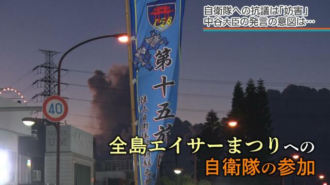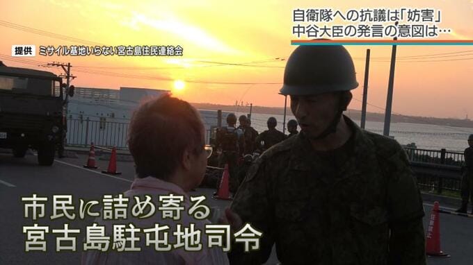 会見で中谷大臣は今回の日米共同訓練への抗議活動のみならず、全島エイサーまつりへの自衛隊グループの出演取りやめを市民団体が求めたことや、8月に宮古島駐屯地の司令が市民に詰め寄った時の抗議活動を例として挙げました。