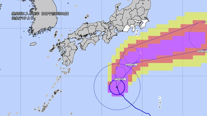 台風は非常に強い勢力を維持しながら、8日は進路を次第に東へ変え、9日は伊豆諸島付近を東北東へ進む見込みです。また、前線が9日朝にかけて、日本の東から伊豆諸島付近にかけてほとんど停滞するでしょう。