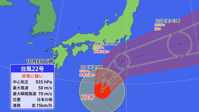 非常に強い台風22号は、8日午前6時には日本の南の北緯29度10分、東経136度55分にあって、1時間に約15キロの速さで北へ進んでいます。
