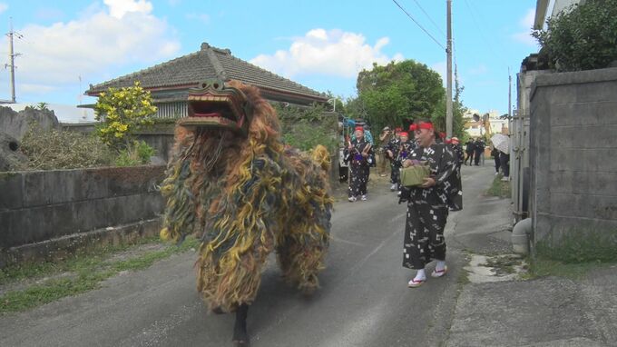 自治会の代表者らはウスデークの演舞に先立ち、集落の拝所「仲大屋(なーかうふや)」に納めてある獅子を取り出して水で清め、獅子を先頭に女性たちが道ジュネーをして地域の厄を払いました。