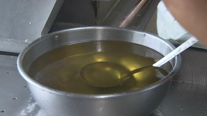 正吉さんは中学生の頃から、母が営んでいた製麺所を手伝ってきた。その頃から変わらないのが、ゆでた麺に油をまぶす工程だ。