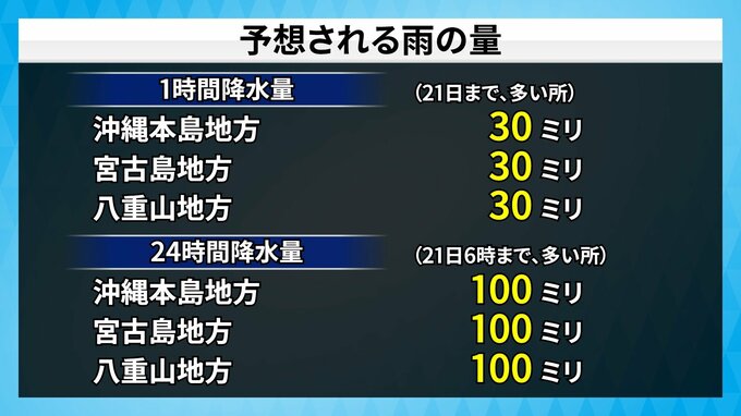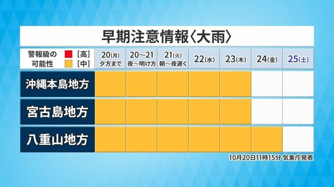 沖縄本島地方と先島諸島では、21日にかけて激しい雨の降る所がある見込みです。雨雲の発達の程度によっては、24日頃にかけて警報級の大雨となるおそれがあります。土砂災害や低い土地の浸水、河川の増水に十分注意してください。
