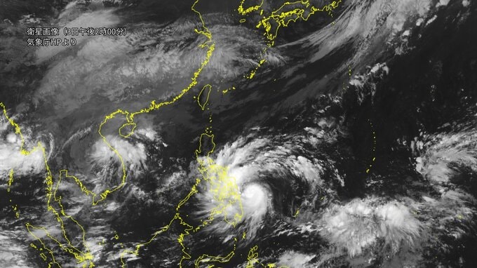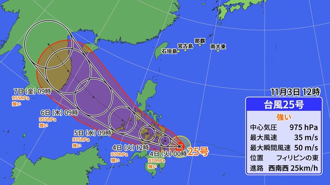 台風25号の勢力は3日正午現在、中心気圧975ヘクトパスカル、中心付近の最大風速35メートル、最大瞬間風速50メートルで、中心から半径65キロ以内では風速25メートル以上の暴風が吹いています。