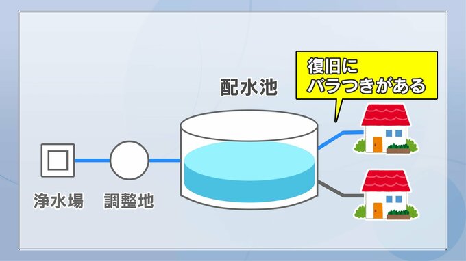 ただ、断水している間には、きれいな水をためておく配水池の水を使用していたため、その配水池の水がある程度回復するまで待つなど別の行程を経て断水が解除となるため、復旧に地域差が生じています。