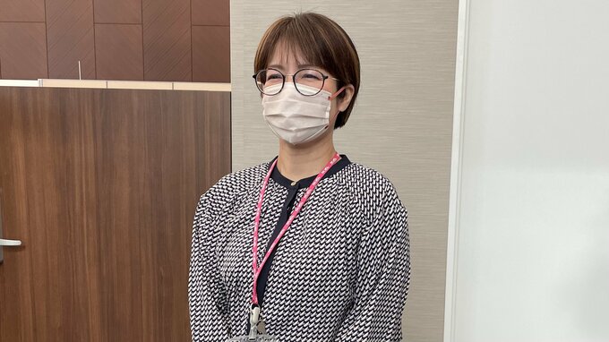 幾何学模様のブラウスが目を引く、入行29年目の女性、上原さん(50)は、3年前の制服廃止から振り返り、「制服の管理が不要になり、身支度が約30分短縮された」と話す。