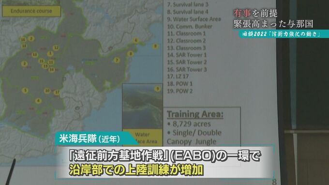 読谷村とほぼ同じおよそ36平方キロメートルにものぼる広大な敷地では、近年、有事の際に、小規模部隊を分散して攻撃拠点をつくる「遠征前方基地作戦」=EABO(イーエービーオー)の一環で、沿岸部での上陸訓練が増えているといいます。