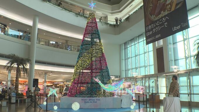 カウントダウンで輝き始めたクリスマスツリー。12日に那覇空港に設置され点灯式が行われました。