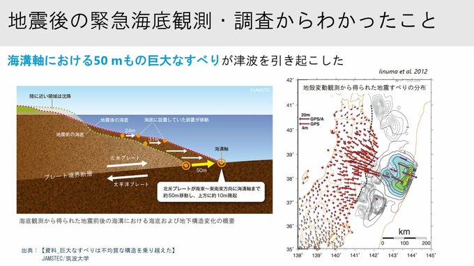 東北地方太平洋沖地震の巨大津波を引き起こした日本海溝。翌年の2012年に行われた緊急調査では、海溝の「軸」が50メートルも東寄りに移動し、上方に10メートルも隆起した「巨大なすべり」が確認されていました。