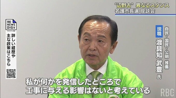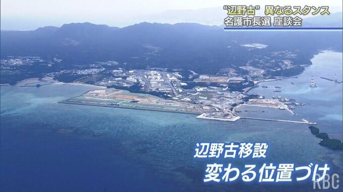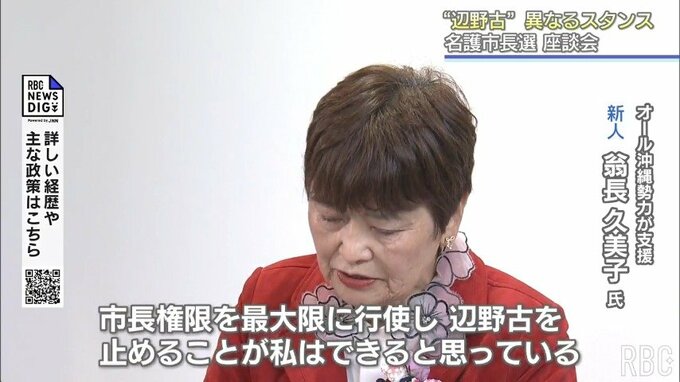 市長が移設受け入れの賛否を示しても工事の進展には影響しないとして、自らの態度を明確にしない現職の渡具知さんに対し、新人の翁長さんは明確に反対を訴えています。