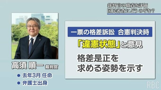 高須順一裁判官は去年3月に任命された弁護士出身の裁判官で、去年最高裁で判決が言い渡された「一票の格差訴訟」に関わった裁判官の1人です。最高裁は「憲法には違反しない」という合憲判決を言い渡していますが、高須裁判官は「投票価値の不均衡は不平等状態」、要は違憲状態だと意見し、格差是正を求める姿勢を示しています。