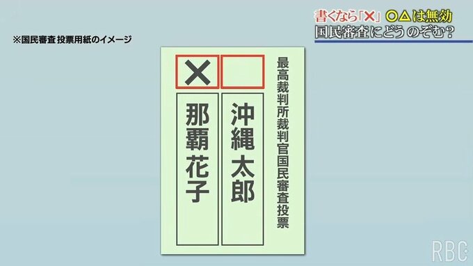 国民審査の投票用紙には、裁判官の名前の上に四角の欄がありますが、「ふさわしくない」と思う裁判官の上の四角に「×(バツ印)」を書かなければいけません。「〇(マル印)」やチェックマークなどを書くと、無効になってしまいます。