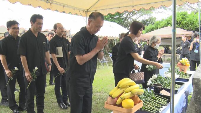 最後に、参列者全員で慰霊碑に菊の花を手向け、犠牲者に祈りを捧げました。(24日:八重山通信員 吉田永吉)