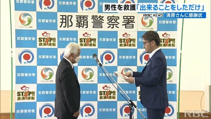 清原(きよはら)さんらは去年2月、那覇市の交差点でオートバイを運転していた男性が、乗用車と衝突して右足の骨を折るなどのけがをした事故の現場に居合わせ、男性を歩道まで運ぶなどの救護活動を行いました。